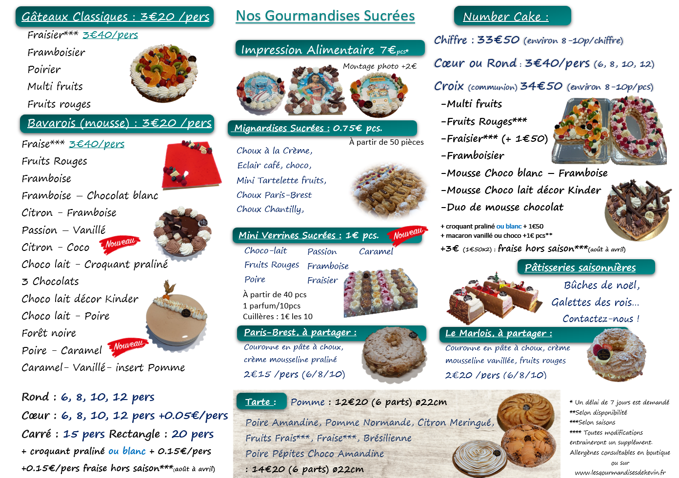Tarifs applicables à partir du 1er Janvier 2026 dans votre Pâtisserie Artisanale Les Gourmandises de Kévin à Marle